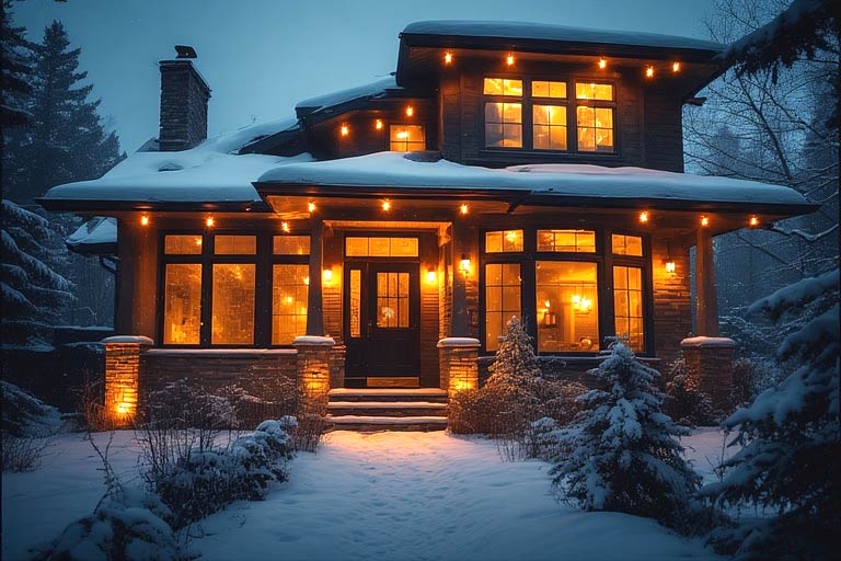 Use warm white LED lights to highlight key areas—your walkway, front door, and maybe that one tree that looks way prettier covered in snow. Avoid harsh, cold lights; they make your home look like an interrogation room, not a winter retreat.