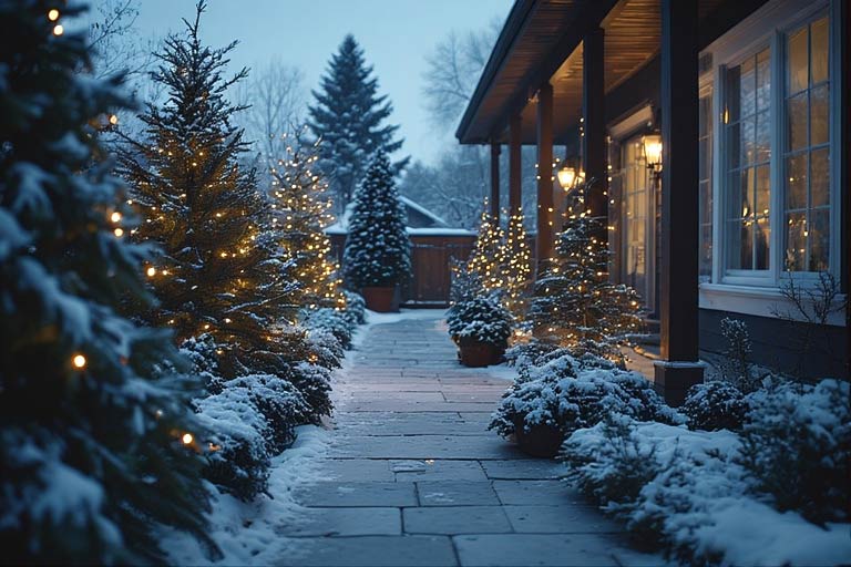 Keep your paths clear, salted, and lit. Add in-ground pathway lights or solar stakes for that subtle guiding glow. You can even line your driveway with mini evergreen shrubs wrapped in lights.