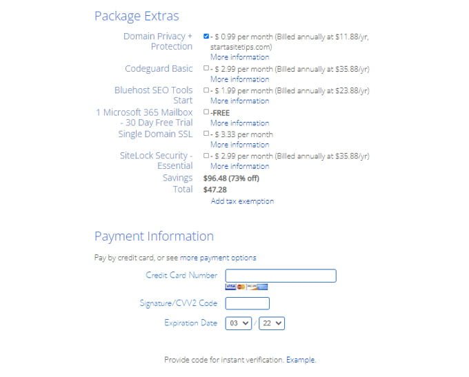 As soon as the domain selection completed, next steps is to enter all the necessary details including personal, business and payment details to make a secured hosting account on bluehost.