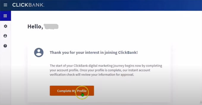 Clickbank will tell to complete profile to get started after joining successfully, click on the button to enter profile and other information